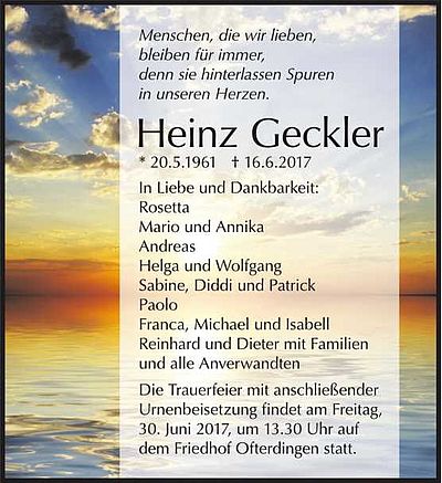 Aufgrund des plötzlichen und unerwarteten Todes unseres Ehemannes und Vaters, Heinz Geckler, kann der Betrieb nicht weitergeführt werden.